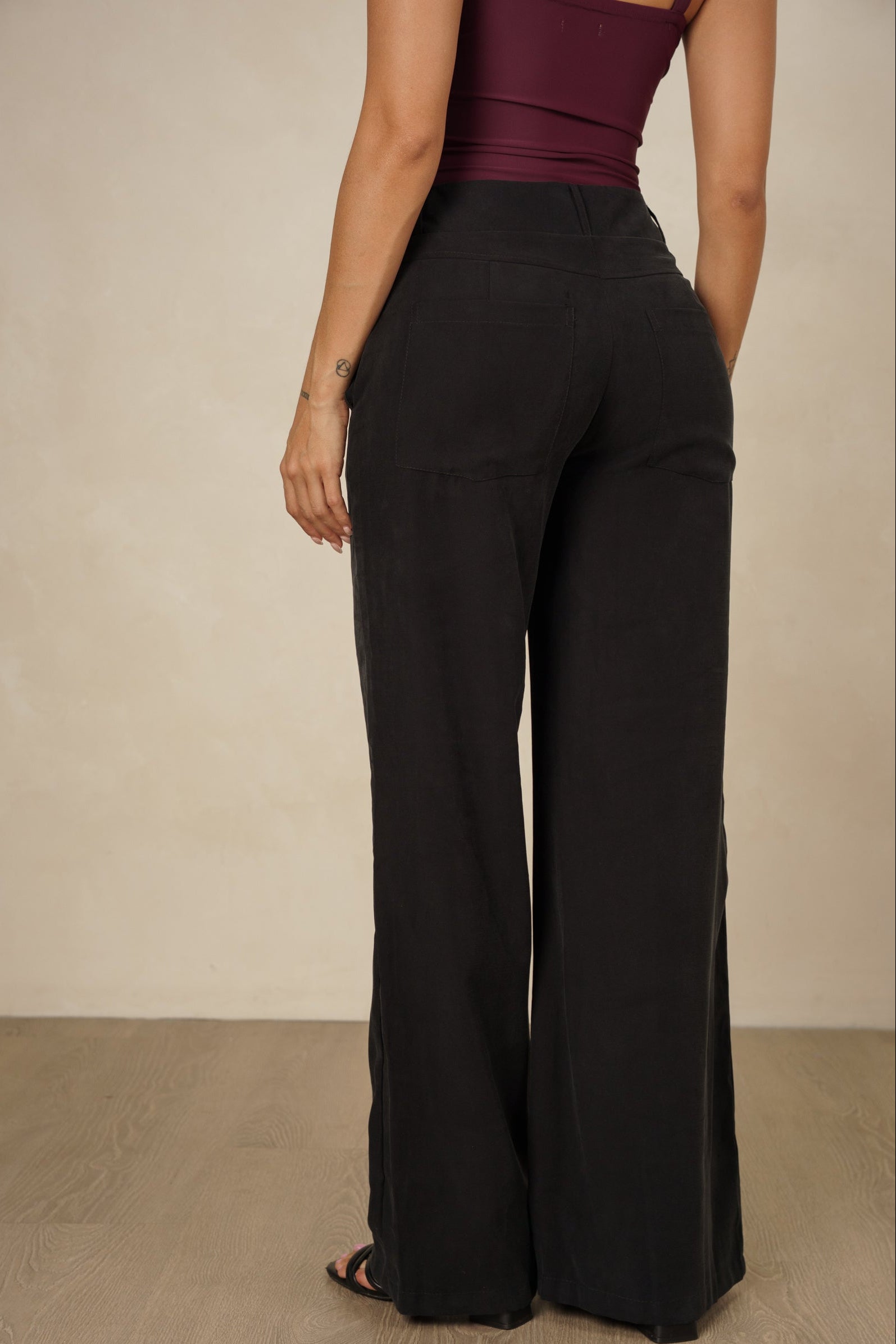 La pieza fundamental para un armario elegante y moderno. Este pantalón negro de tiro alto y pierna ancha ofrece una silueta alargada y fluida, perfecta para estilizar la figura. La costura vertical delantera añade un detalle sofisticado que simula el pliegue de un pantalón de sastre, aportando estructura y elevando su diseño.