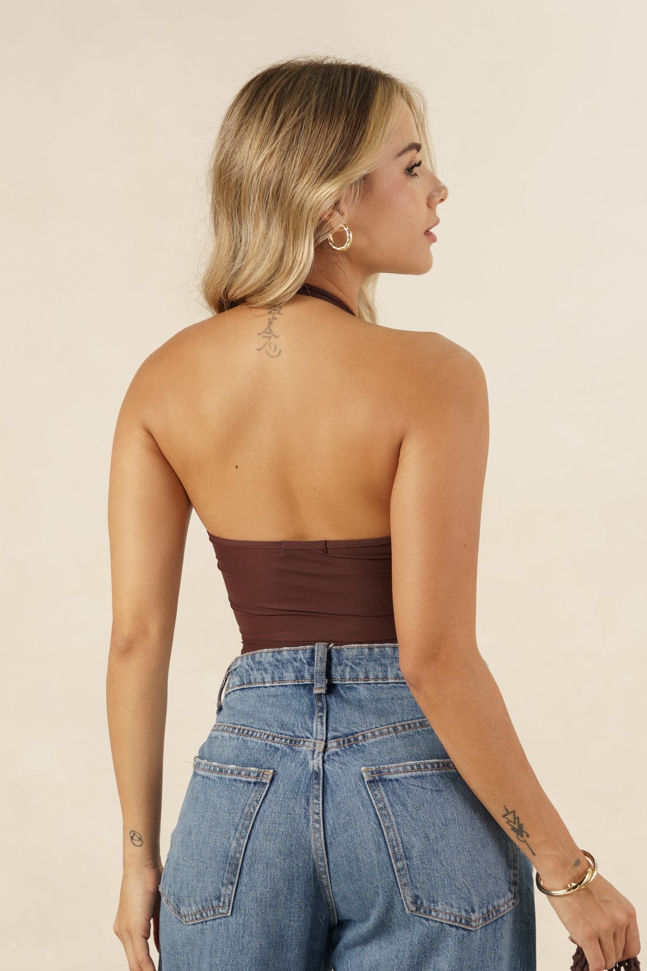 Un básico sofisticado para crear looks con profundidad y carácter. Este body en tono marrón chocolate cuenta con un escote halter que enmarca el cuello y destaca los hombros, aportando un toque de elegancia terrenal y moderna. Su diseño sin mangas brinda un acabado pulido y versátil.