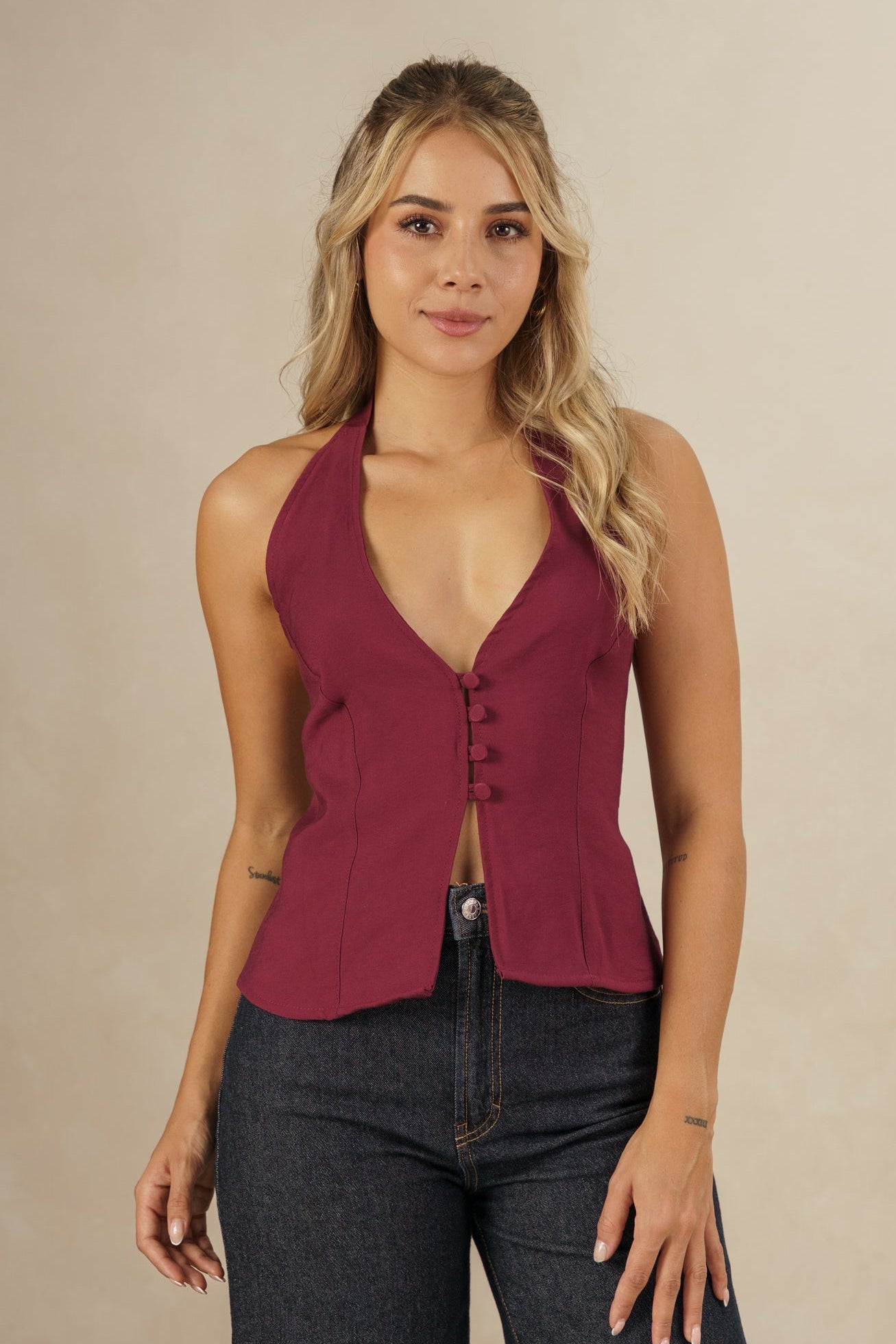 Chaleco Halter Vinotinto con Botones Frontales