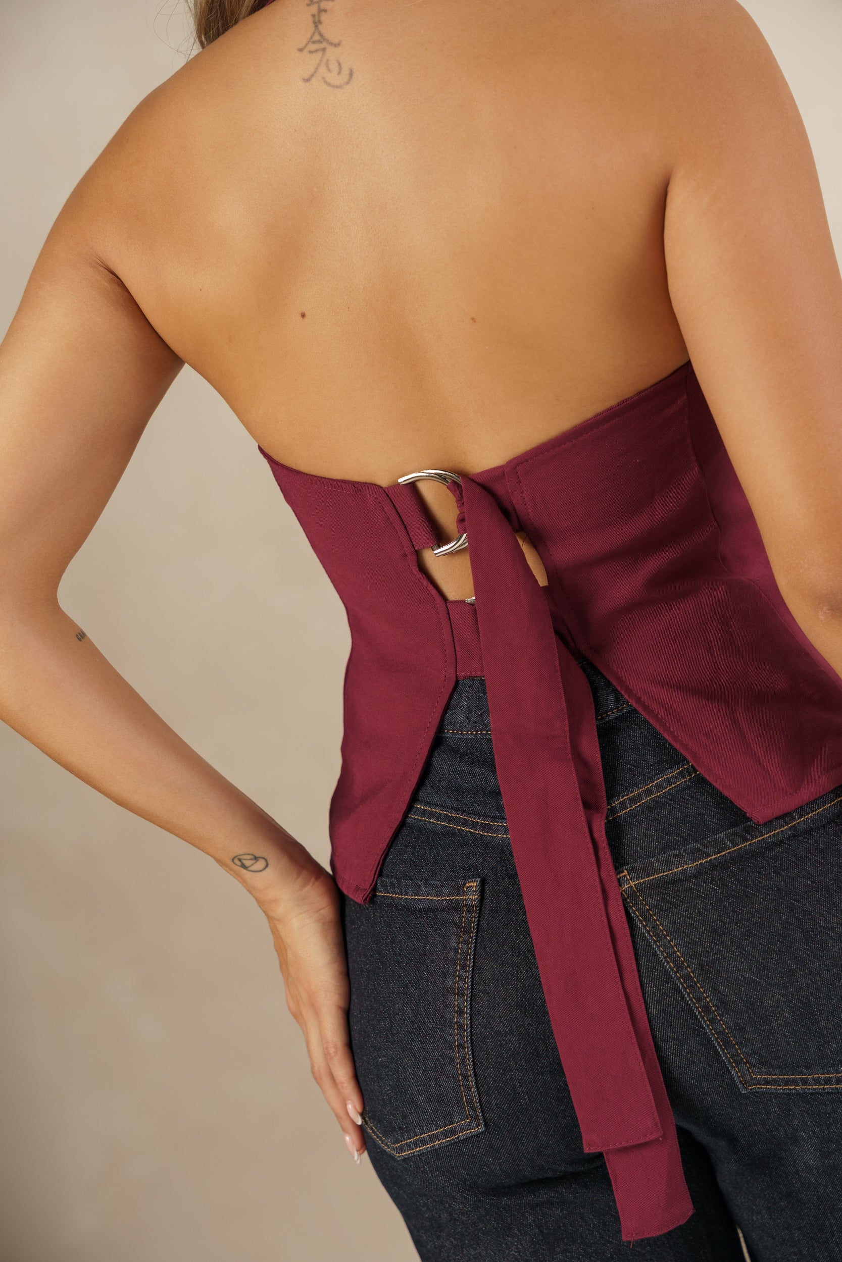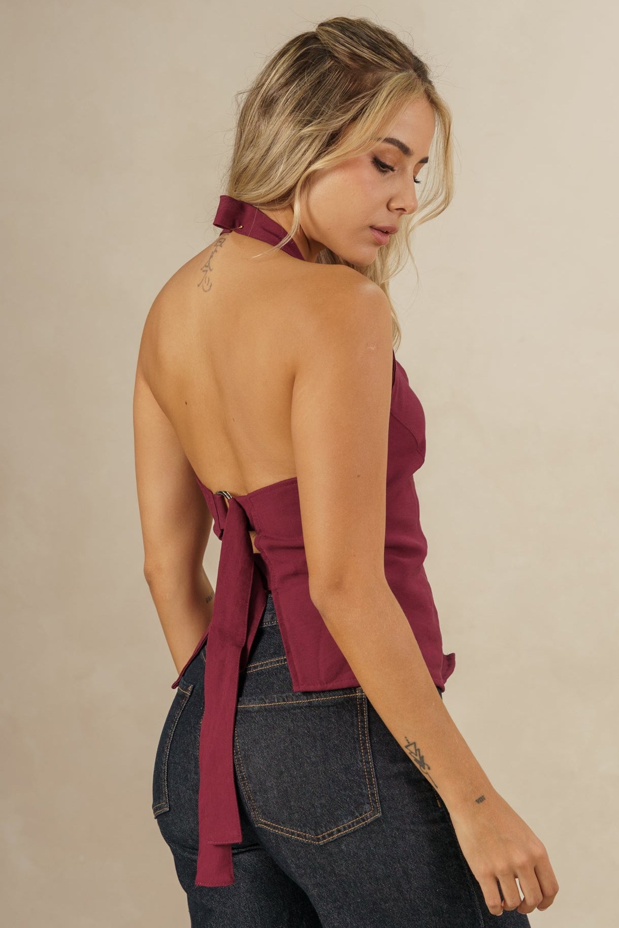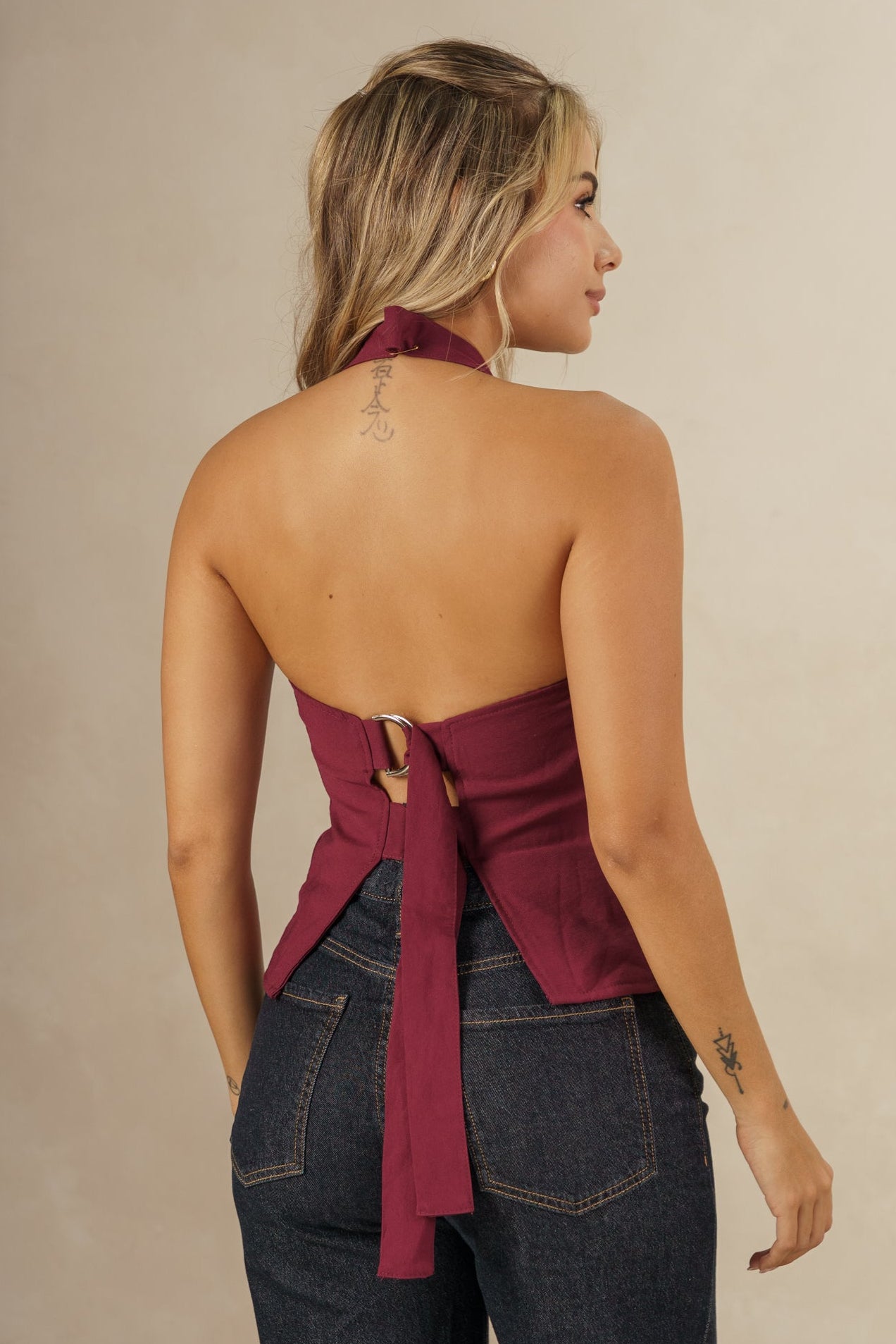 Un básico sofisticado para crear looks modernos y llenos de estilo. Este chaleco halter en color vinotinto destaca por su escote profundo en “V” y su silueta entallada que resalta la figura de manera sutil y elegante.
