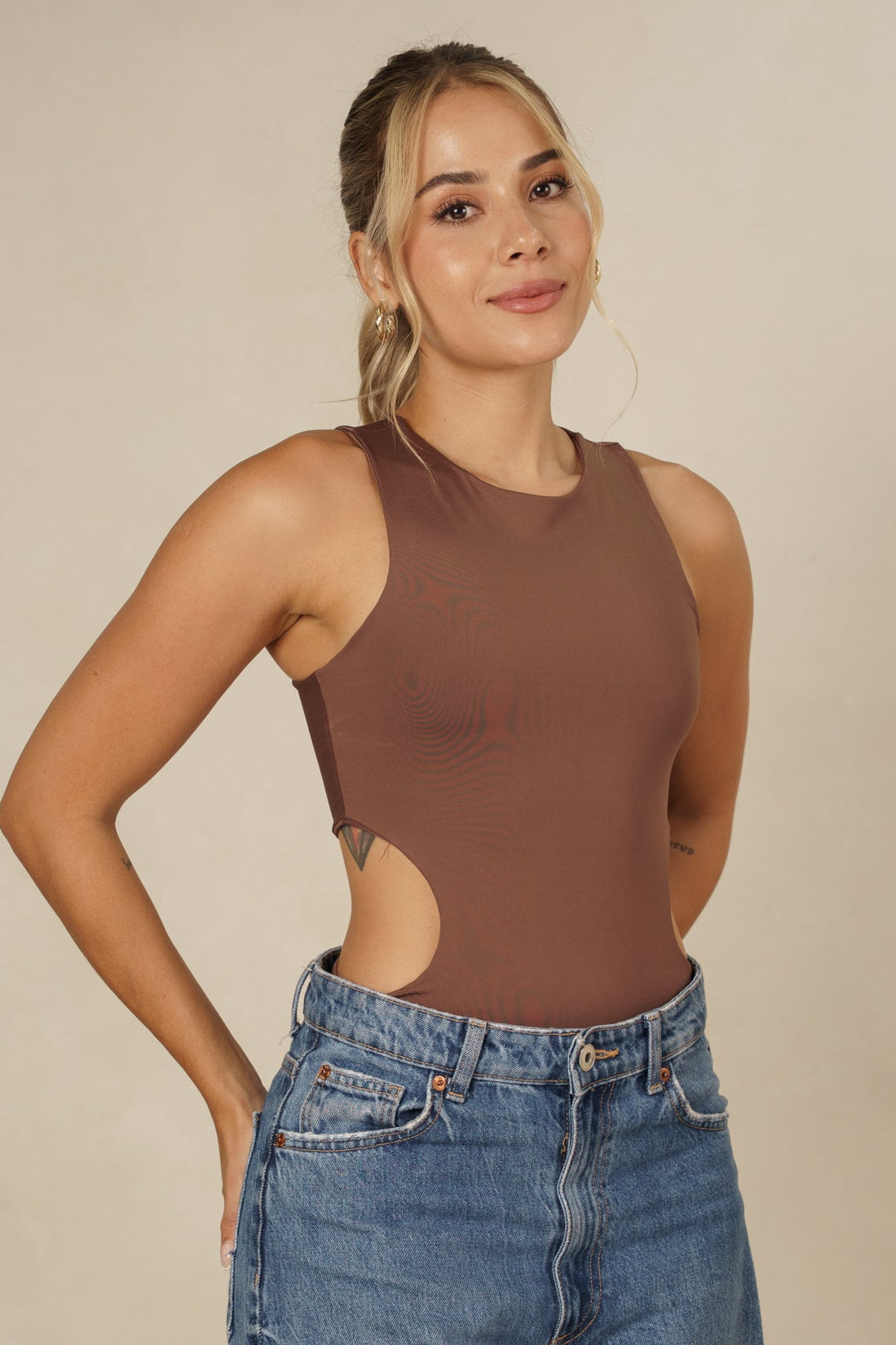 - Diseño Cut-Out Lateral: Presenta estratégicas aberturas a los lados (cut-outs) que añaden un elemento de sensualidad y revelan sutilmente la figura, creando un efecto visual estilizador.